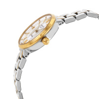 Корпус: Корпус из полированной/матовой нержавеющей стали с частичным PVD покрытием. Перламутровый циферблат украшен камнями и радиальным декоративным узором. Листовидные стрелки в стиле Feuille. Метки в виде римских цифр и штрихов. Рифленая заводная головка. Задняя крышка с гравировкой. Сапфировое стекло с антибликовым покрытием. Диаметр 32 мм. Водостойкость 100 м. Система DS.