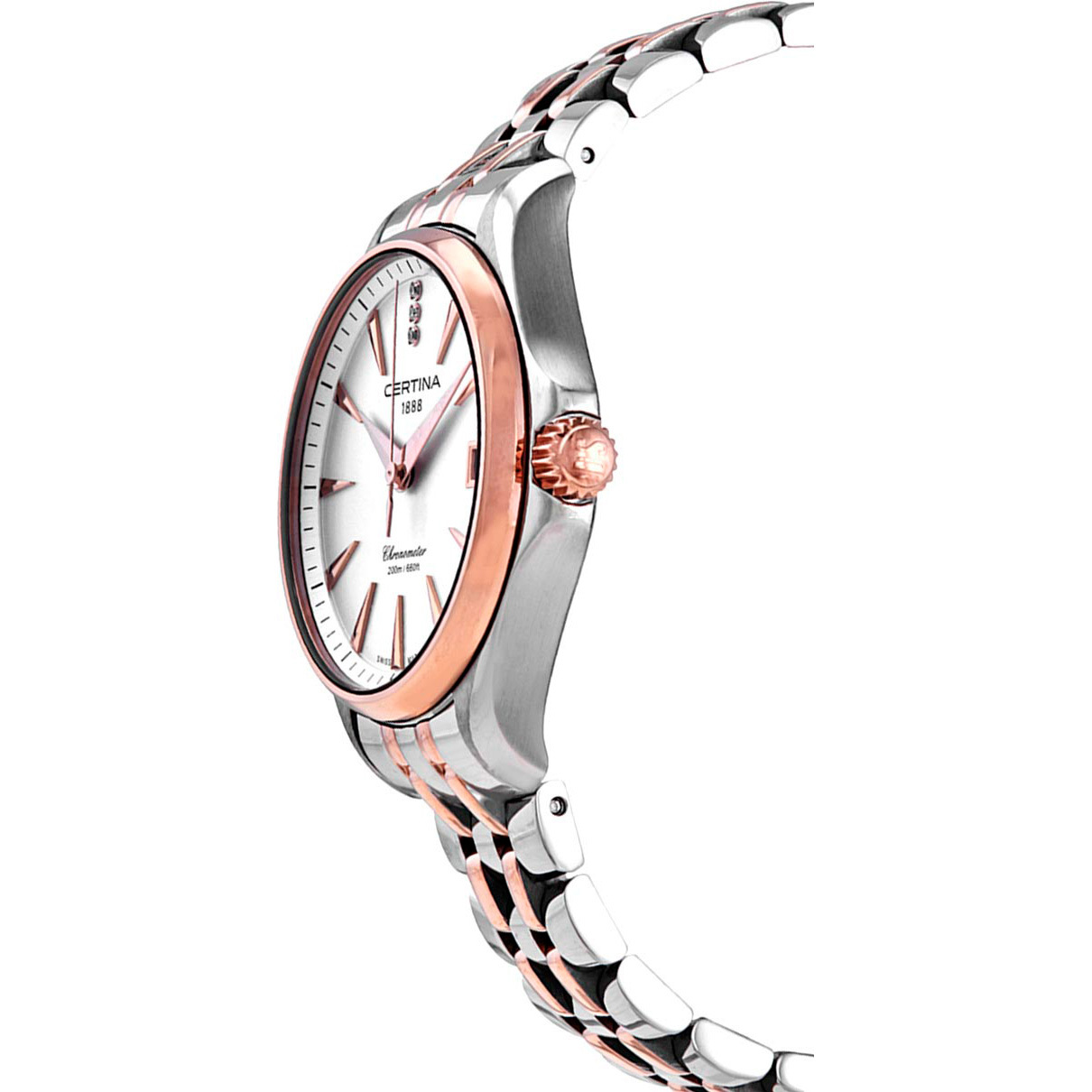 Корпус: Корпус из нержавеющей полированной/матовой стали, безель с PVD - покрытием розового цвета. Металлик циферблат украшен тримя бриллиантами. Стрелки и риски золотистого цвета. Сапфировое стекло с антибликовым покрытием. Диаметр 34 мм. Водостойкость 100 м. Система DS.