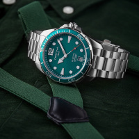 Корпус: Корпус из нержавеющей стали. Вращающийся безель. Покрытие Superluminova. Сапфировое стекло с антибликовым покрытием. Зеленый циферблат. Диаметр 43 мм. Водонепроницаемость 300 метров.