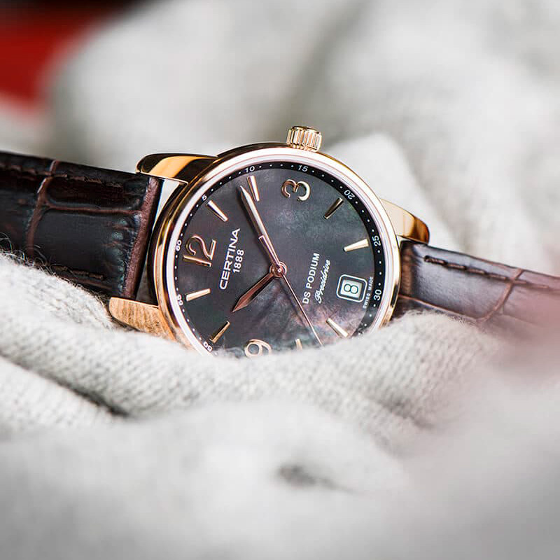 Корпус: Корпус из полированной/матовой нержавеющей стали с PVD - покрытием золотом. Перламутровый циферблат с золотистыми стрелками и часовыми индексами. Сапфировое стекло. Диаметр 33 мм. Водостойкость 100 м. Система DS.