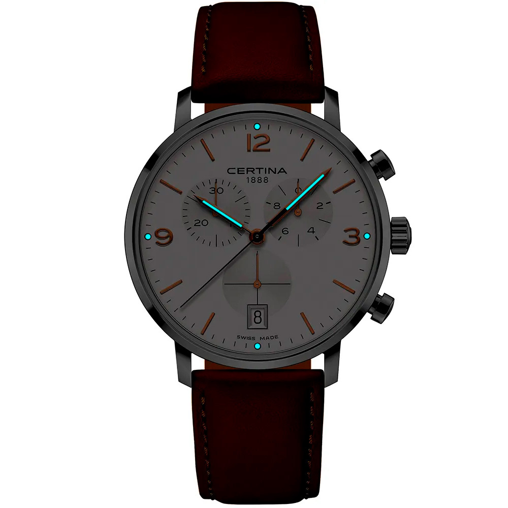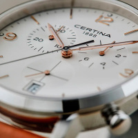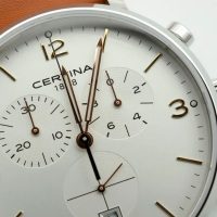 Функции: Индикация часов, минут при помощи центральных стрелок. Маленькая, отдельно вынесенная секундная стрелка. Дата в положении "6 часов". Хронограф.