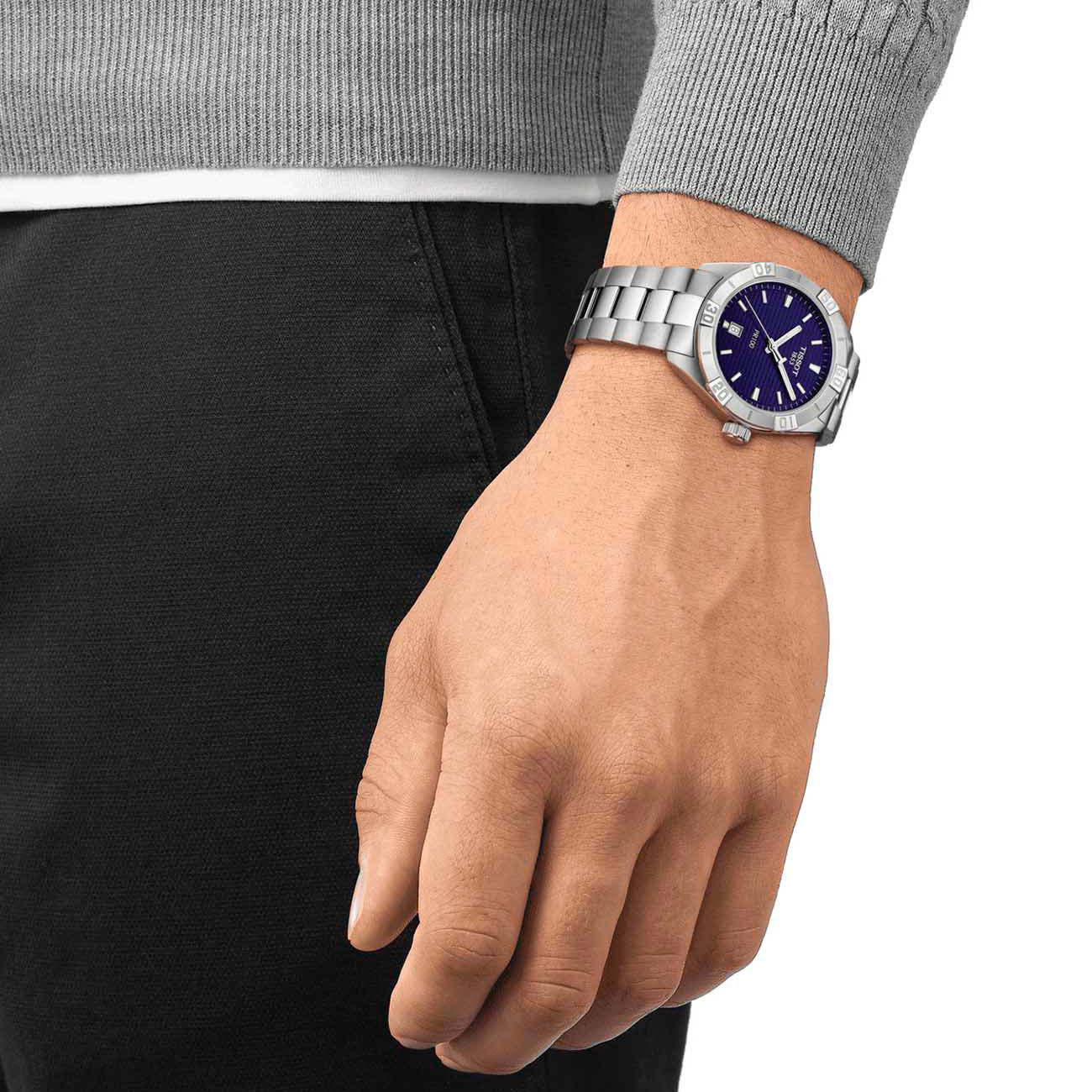 Корпус: Корпус выполнен из высококачественной стали 316L с повышенной устойчивостью к коррози, c сатинированной поверхностью. Безель с минутной шкалой. Синий циферблат украшен узором из горизонтальных линий. Прямоугольные стрелки в стиле Baton. Метки и стрелки с люминесцентным покрытием, которое светится в темноте после непродолжительной зарядки на свету. Сапфировое стекло. Рифленая заводная головка. Диаметр корпуса 42 мм. Водозащита 100 метров.