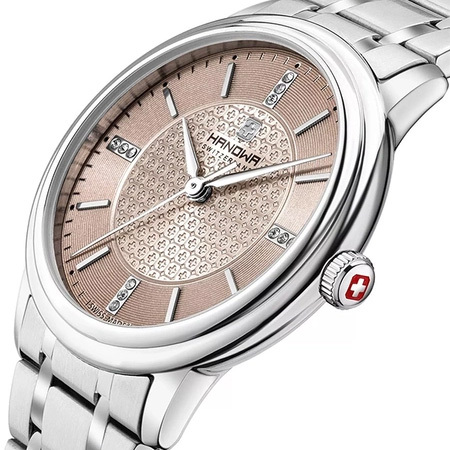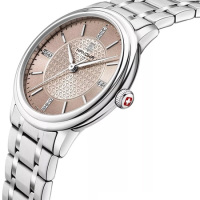Корпус: Корпус из нержавеющей полированной стали 316L. Гильошированный циферблат розового цвета, инкрустирован кристаллами Swarovski. Стрелки и часовые индексы стальные. Минеральное стекло. Диаметр 34 мм. Водостойкость 50 м.