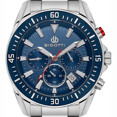 Функции: Индикация часов, минут и секунд при помощи центральных стрелок. Дата, хронограф и текущее время в 24-х часовом формате.