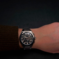 Функции: Индикация часов, минут и секунд при помощи центральных стрелок. Часы с отображением второго часового пояса, дня недели и текущего времени в 24-х часовом формате на малых циферблатах. Присутствует окошко даты.