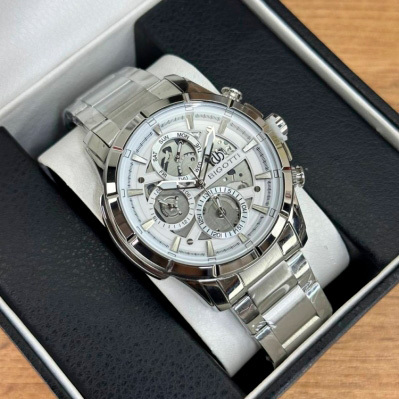 Корпус: Стильные мужские часы со скелетонизированным циферблатом. Корпус изготовлен из латуни и имеет надёжное износостойкое покрытие серебристого цвета. Циферблат серебристого цвета. Часовые индексы и стрелки с люминесцентным покрытием. Прочное минеральное стекло обеспечит защиту часов от повреждений. Диаметр: 44 мм. Водонепроницаемость: 50 м.