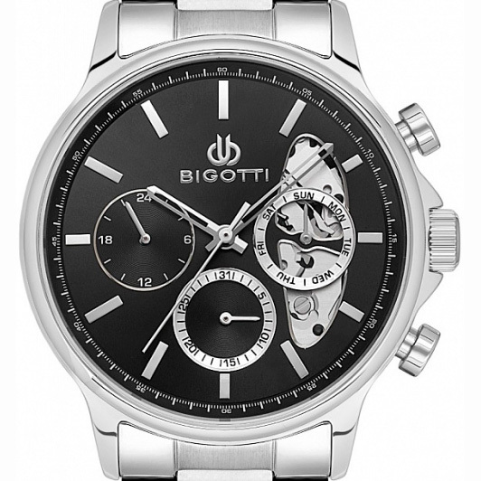 Функции: Индикация часов, минут и секунд при помощи центральных стрелок. На малых циферблатах отображается дата, день недели и текущее время в 24-х часовом формате.