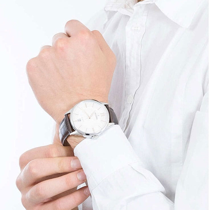 Функции: Центральные часовая, минутная и секундная стрелки, индикация даты в апертуре на отметке “6 часов”.