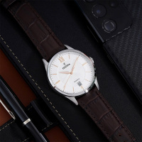 Корпус: Корпус выполнен из высококачественной стали с повышенной устойчивостью к коррозии, поверхность с матовой шлифовкой – сатинированием и полировкой до зеркального блеска. Светлый циферблат часов украшен декоративным узором - гильоше. Накладные часовые метки в виде штрихов, 12-ти часовая метка в виде римской цифры, стрелки в стиле Alpha выполнены из стали с позолотой. Люминесцентный состав светящийся в темноте на стрелках. Минеральное стекло защищает циферблат от повреждений. Рифленая заводная головка. Диаметр: 43 мм, толщина 10,35 мм. Водозащита: 50 м.