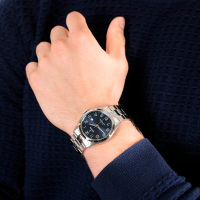 Корпус: Ударопрочный корпус часов сделан из нержавеющей стали. Циферблат выполнен по технологии Sunray (солнечные лучи) синего цвета с серебристыми стрелками и часовыми индексами в виде арабских цифр. Часовая и минутная стрелки с нанесенным люминесцентным покрытием, которое светится в темноте после непродолжительной зарядки на свету. Минеральное стекло. Рифленая заводная головка с защитой. Диаметр: 40 мм. Водонепроницаемость: 100 м.