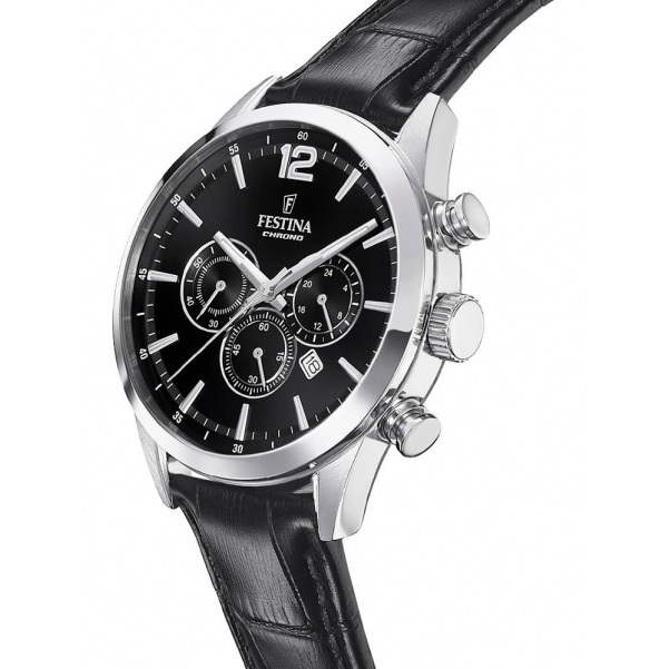 Корпус: Круглый корпус изготовлен из полированной нержавеющей стали 316L. Циферблат черный, выполнен по технологии Sunray (солнечные лучи) и украшен фирменным логотипом Festina Chrono. Метки в виде штрихов и арабской цифры 12. Минеральное стекло. Рифленая заводная головка. Диаметр: 43,5 мм. Водостойкость: 50 метров.
