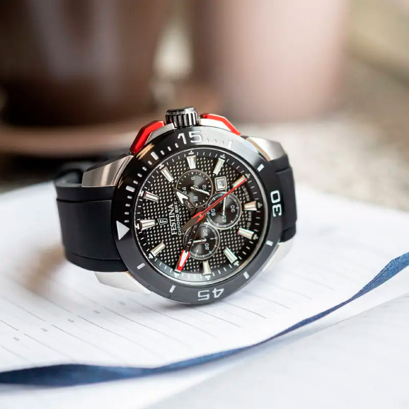 Корпус: Ударопрочный корпус часов сделан из нержавеющей стали. Неподвижный безель из нержавеющей стали с PVD-покрытием чёрного цвета. Чёрный циферблат со стрелками и часовыми индексами в виде штрихов с нанесенным люминесцентным покрытием, которое светится в темноте после непродолжительной зарядки на свету. Минеральное стекло устойчивое к возникновению царапин. Рифленая заводная головка с защитой. Диаметр: 47 мм. Водонепроницаемость: 100 м.