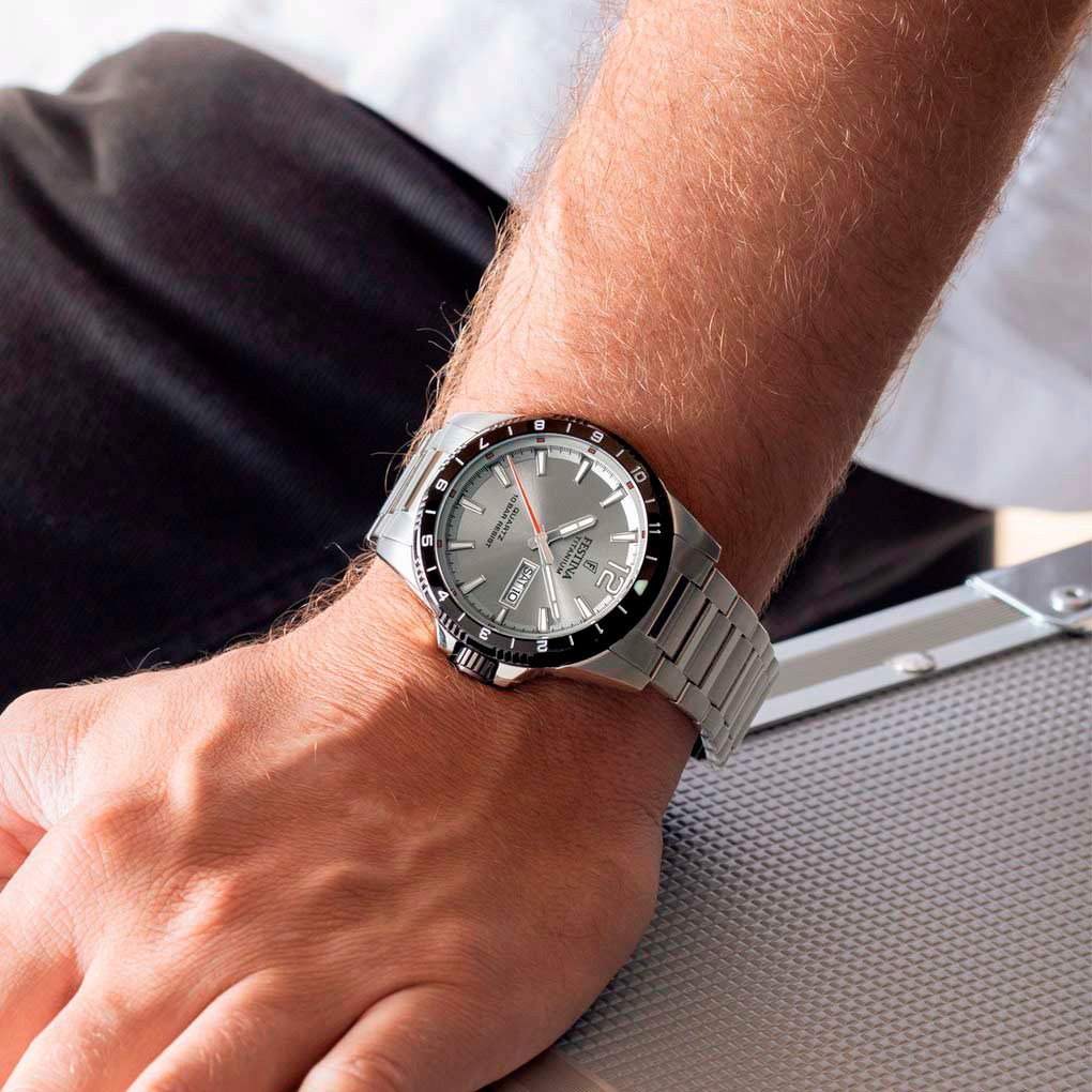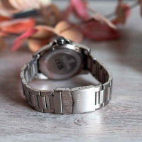 Корпус: Круглый титановый корпус с частичным PVD покрытием. Безель с часовыми метками. Циферблат выполнен по технологии Sunray (солнечные лучи). Метки в виде штрихов и арабской цифры 12. Минеральное стекло более устойчиво к появлению небольших царапин и потертостей, хорошо может выдержать небольшие удары и падения. Стрелки с люминесцентным покрытием. Рифленая заводная головка с защитой. Завинчивающаяся задняя крышка. Диаметр 43 мм. Водонепроницаемость 100 м.