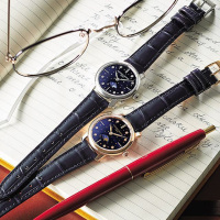 Корпус: Нержавеющая сталь. Сапфировое стекло. Синий циферблат с серебристыми стрелками, украшен 8-ю бриллиантами. Водозащита 30 метров. Диаметр 30 мм.