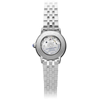 Корпус: Корпус круглой формы выполнен из нержавеющей стали марки 316L, поверхности с матовой шлифовкой и глянцевой полировкой. Циферблат из натурального перламутра, дополнительный индикатор с гильошированием в виде концентрических линий. Аппликация римских цифр с покрытием цвета родия и стрелки с синей лакировкой. Инкрустация 5 бриллиантов в качестве часовых меток. Сапфировое стекло имеет повышенную устойчивость к возникновению царапин. Диаметр корпуса модели составляет 34 мм, толщина - 9,8 мм. Задняя крышка с прозрачным окном из сапфирового стекла. Водостойкость на глубине до 50 метров (5 бар/АТМ).