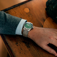 Корпус: Корпус круглой формы выполнен из нержавеющей стали марки 316L с матовой шлифовкой и глянцевой полировкой. Циферблат насыщенного зеленого цвета, центральная часть с шлифовкой “солнечные лучи”, гильоширование в виде концентрических линий на внешней стороне циферблата. Аппликация часовых индексов и стрелки с покрытием родием. Люминесцентное покрытие Super-Luminova®, светящееся в темноте, нанесено на стрелки и разметку циферблата. Сапфировое стекло имеет повышенную устойчивость к возникновению царапин. Завинчивающаяся заводная коронка с монограммой RW. Диаметр корпуса модели составляет 42 мм, толщина – 10.5 мм. Водостойкость на глубине до 100 метров (10 бар/АТМ).