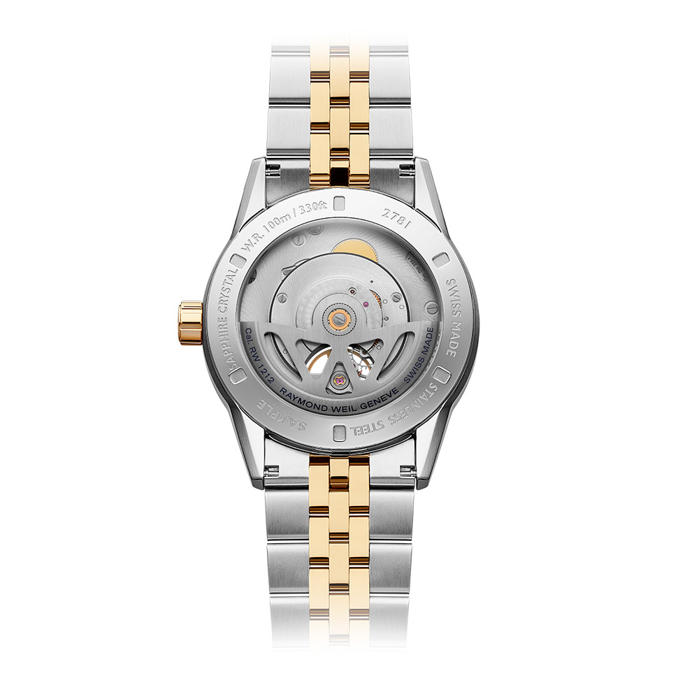 Ремешок: Браслет из высококачественной стали с 5 рядами литых звеньев, центральный ряд звеньев с золотым покрытием. Браслетная застежка, раскладывающаяся при нажатии на кнопки с двойной системой блокировки, украшена гравировкой Raymond Weil.