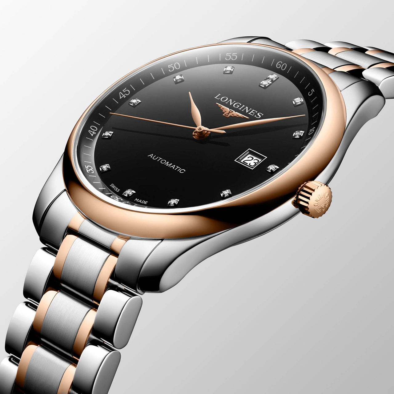 Корпус: Нержавеющая сталь/розовое золото. Циферблат лаковый, черного цвета, позолоченные стрелки, 13 бриллиантов. Сапфировое стекло. Водонепроницаемость 30 метров. Размер 42 мм.