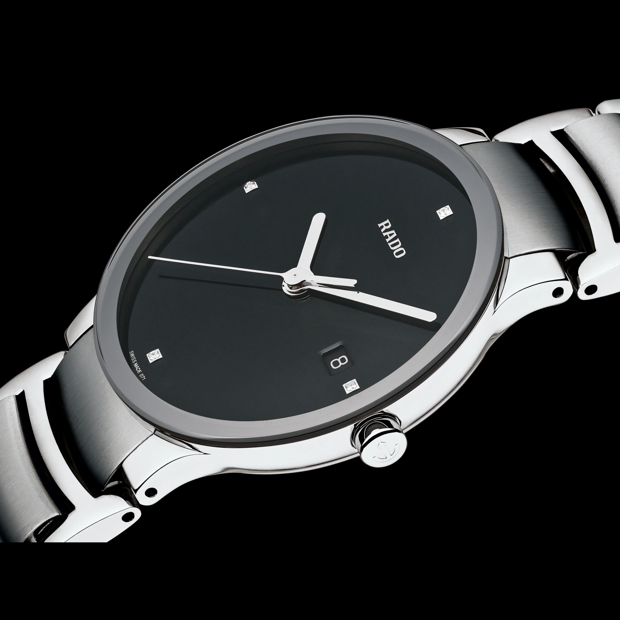 Корпус: Нержавеющая сталь. Сапфировое стекло. Диаметр 38 мм, водонепроницаемость 30 метров. Циферблат черный. 4 бриллианта на циферблате.
