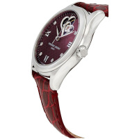 Корпус: Корпус круглой формы выполнен из нержавеющей стали марки 316L, поверхности с финишной полировкой. Циферблат цвета бургунди, центральная часть с гильошированием и инкрустирован бриллиантами. Фигурные стрелки серебристого цвета отполированы вручную. Сапфировое стекло выпуклой формы имеет повышенную устойчивость к возникновению царапин. Диаметр 36 мм. Водостойкость 50 метров (5 АТМ).