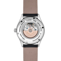 Корпус: Круглый корпус выполнен из высококачественной стали марки 316L, практически не поддающейся коррозии, поверхности с финишной полировкой. Циферблат необычного цвета хаки с гильошированием "clous de Paris". Римские цифры, выполненные методом печати, и стрелки в стиле ”яблоко Бреге” с серебристым покрытием. Куполообразное сапфировое стекло имеет повышенную устойчивость к возникновению царапин. Задняя крышка с прозрачным окном имеет резьбовое соединение с корпусом. Диаметр корпуса модели составляет: 40 мм, толщина: 10,5 мм. Водостойкость: 50 метров (5 АТМ).