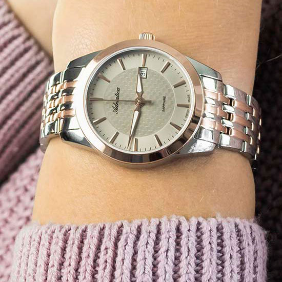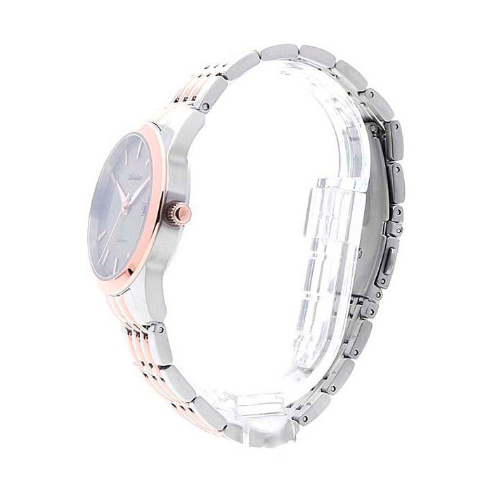 Корпус: Круглый корпус выполнен из полированной нержавеющей стали с частичным розовым PVD покрытием. Светлый циферблат с узором гильоше. Накладные часовые индексы выполнены из стали с золотым покрытием. Стрелки с покрытием SuperLuminova, которое обеспечивает подсветку в темное время суток. Сапфировое стекло. Диаметр корпуса составляет 32 мм, толщина 8 мм. Водостойкость WR 50 (мытье рук, дождь).
