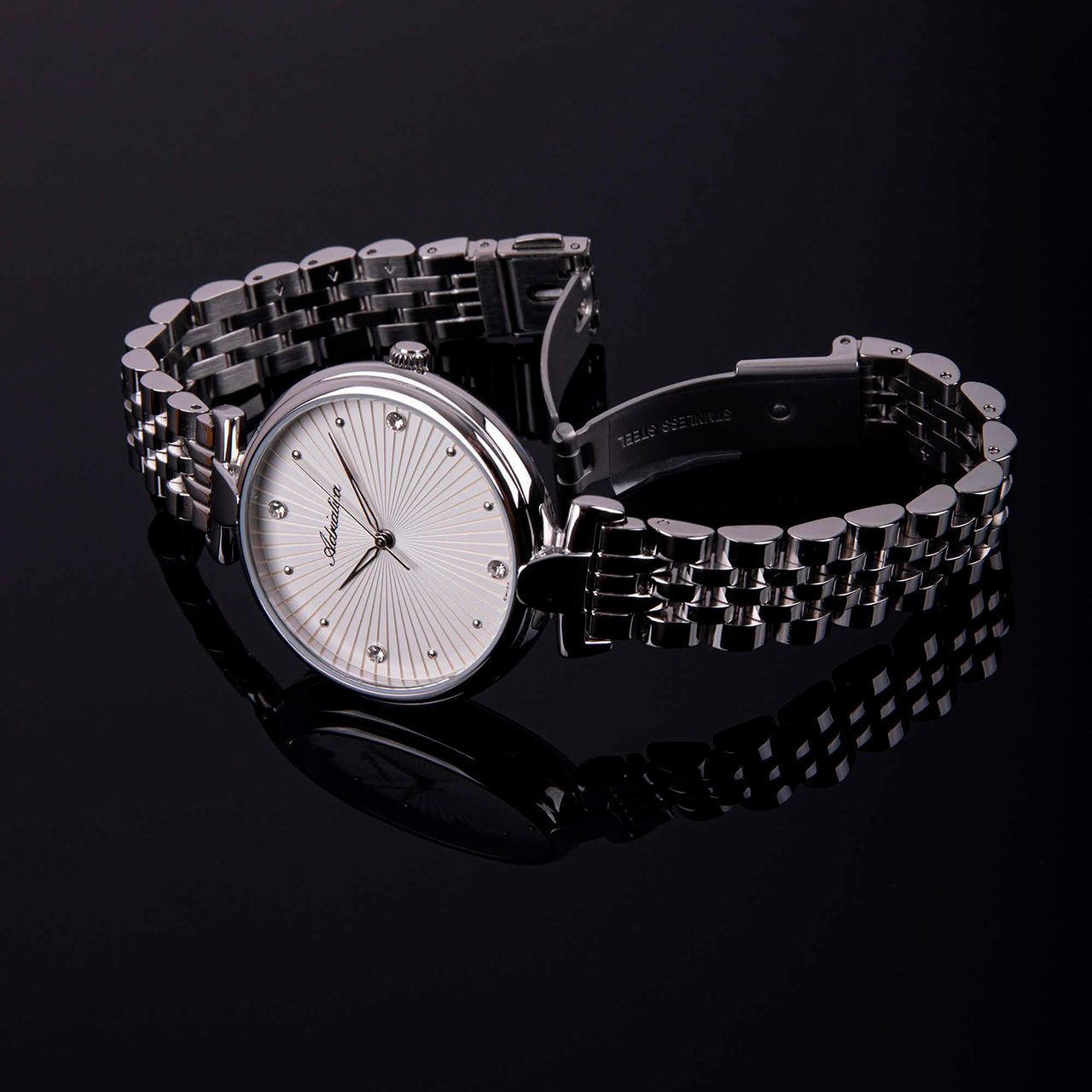 Корпус: Круглый корпус выполнен из полированной нержавеющей стали. Синий циферблат с узором гильоше. Накладные часовые индексы выполненый из стали. Стрелки с покрытием SuperLuminova, которое обеспечивает длительную подсветку в темное время суток. Устойчивое к возникновению царапин сапфировое стекло. Диаметр корпуса составляет 40 мм, толщина 7 мм. Водостойкость WR 50 (мытье рук, дождь).