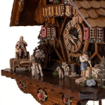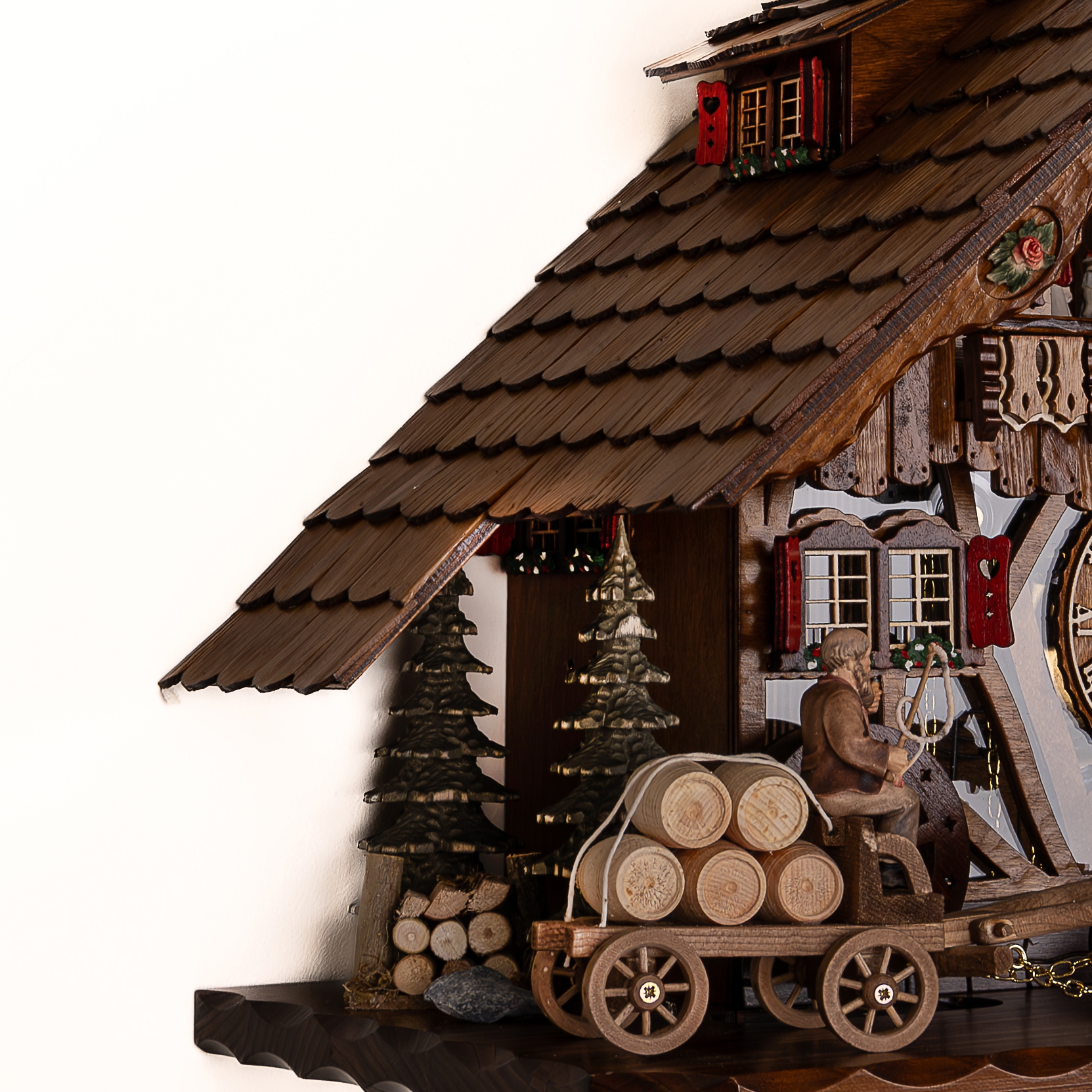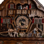 Механизм: Механические часы с кукушкой, которые работают от гирь на цепной тяге. Сделан механизм на фирме SBS-Feintechnik GmbH & Co. KG Германия. Шварцвальдский дом с подвижным дровосеком и танцующими парами на балконе. Запас хода на 8 дней. Ручное отключение звука. В каждые пол часа кукушка появляется из своего домика, наклоняется и воспроизводит звук кукушки (ку-ку) один раз, в каждый полный час она кукует столько раз сколько показывают стрелки на часах. После этого на балкончике начинают кружиться в танце деревянные фигурки под музыку (2 мелодии чередуются). Одна гиря в данных часах отвечает за ход часового механизма, вторая за механизм кукушки, а третья за воспроизведение музыки, как в музыкальной шкатулке и движение танцующих фигурок на балконе. В то время пока кукушка кукует дровосек колет дрова и продолжает это делать пока кукушка не остановится.