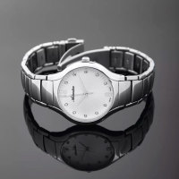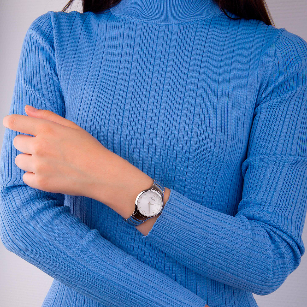 Корпус: Круглый корпус выполнен из полированной нержавеющей стали. Серебристый циферблат с узором гильоше, украшен 10 кристаллами. Накладные часовые индексы выполнены из стали. Минеральное стекло. Диаметр корпуса составляет 33 мм, толщина 7 мм. Водостойкость WR 30 (мытье рук, дождь).