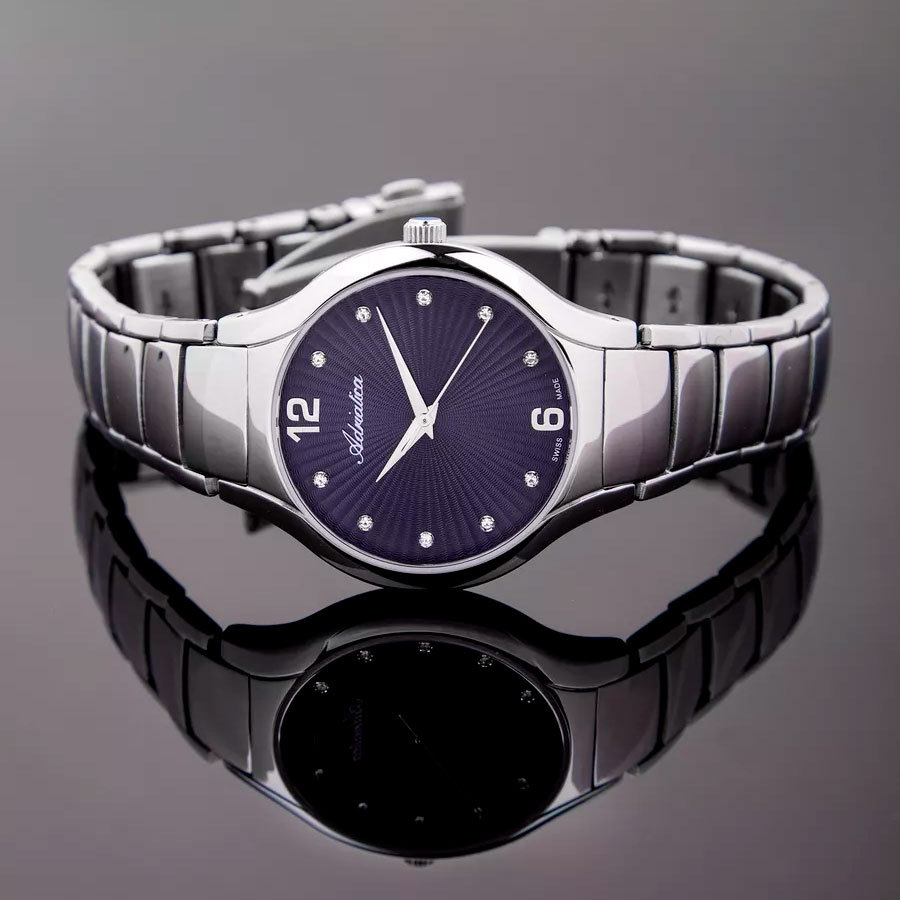 Корпус: Круглый корпус выполнен из полированной нержавеющей стали. Циферблат синего цвета украшен 10 цирконами. Сапфировое стекло, устойчивое к царапинам. Диаметр корпуса составляет 33 мм, толщина 7 мм. Водостойкость WR 30 (мытье рук, дождь).