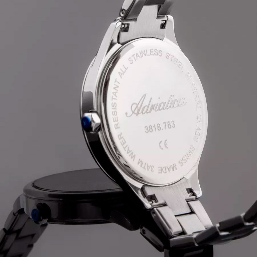 Корпус: Круглый корпус выполнен из полированной нержавеющей стали. Циферблат серебристого цвета с метками в виде штрихов, украшен фианитами. Минеральное стекло с сапфировым покрытием. Диаметр корпуса составляет 34 мм, толщина 8 мм. Водостойкость WR 30 (мытье рук, дождь).