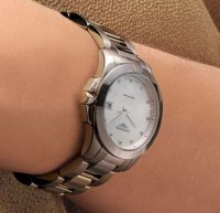 Корпус: Нержавеющая сталь. Циферблат белый перламутровый, 11 бриллиантов. Сапфировое стекло с антибликовым покрытием. Водонепроницаемость 300 метров. Размер 34 мм.