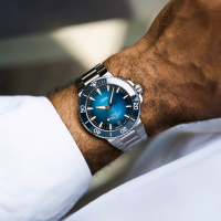 Корпус: Многокомпонентный корпус из нержавеющей стали. Керамический безель с минутной шкалой вращается в одном направлении. Циферблат выполнен по технологии Sunray (солнечные лучи) синего цвета. Сапфировое стекло, выпуклое с обеих сторон, внутреннее антибликовое покрытие. Индексы и стрелки покрыты составом Superluminova BG W9. Завинчивающаяся задняя крышка со специальной гравировкой. Завинчивающаяся заводная головка из нержавеющей стали. Диаметр: 43,5 мм. Водонепроницаемость: 300 метров.