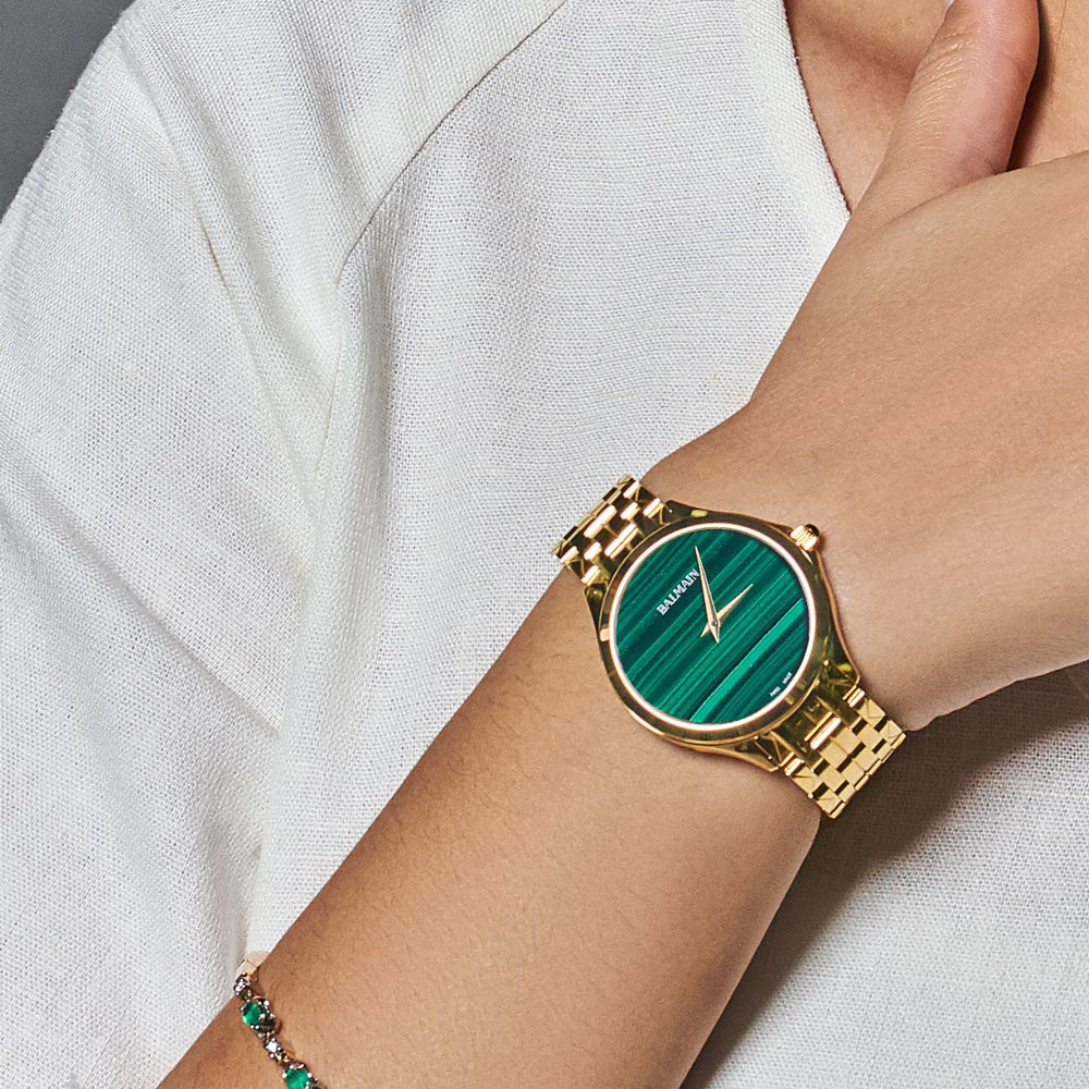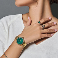 Корпус: Нержавеющая сталь с PVD-покрытием из жёлтого золота. Циферблат выполнен из натурального камня Малахит. Сапфировое стекло с антибликовым покрытием. Заводная головка с защитой, украшена камнем в форме кабошона. Диаметр 34 мм. Водостойкость 50 м.
