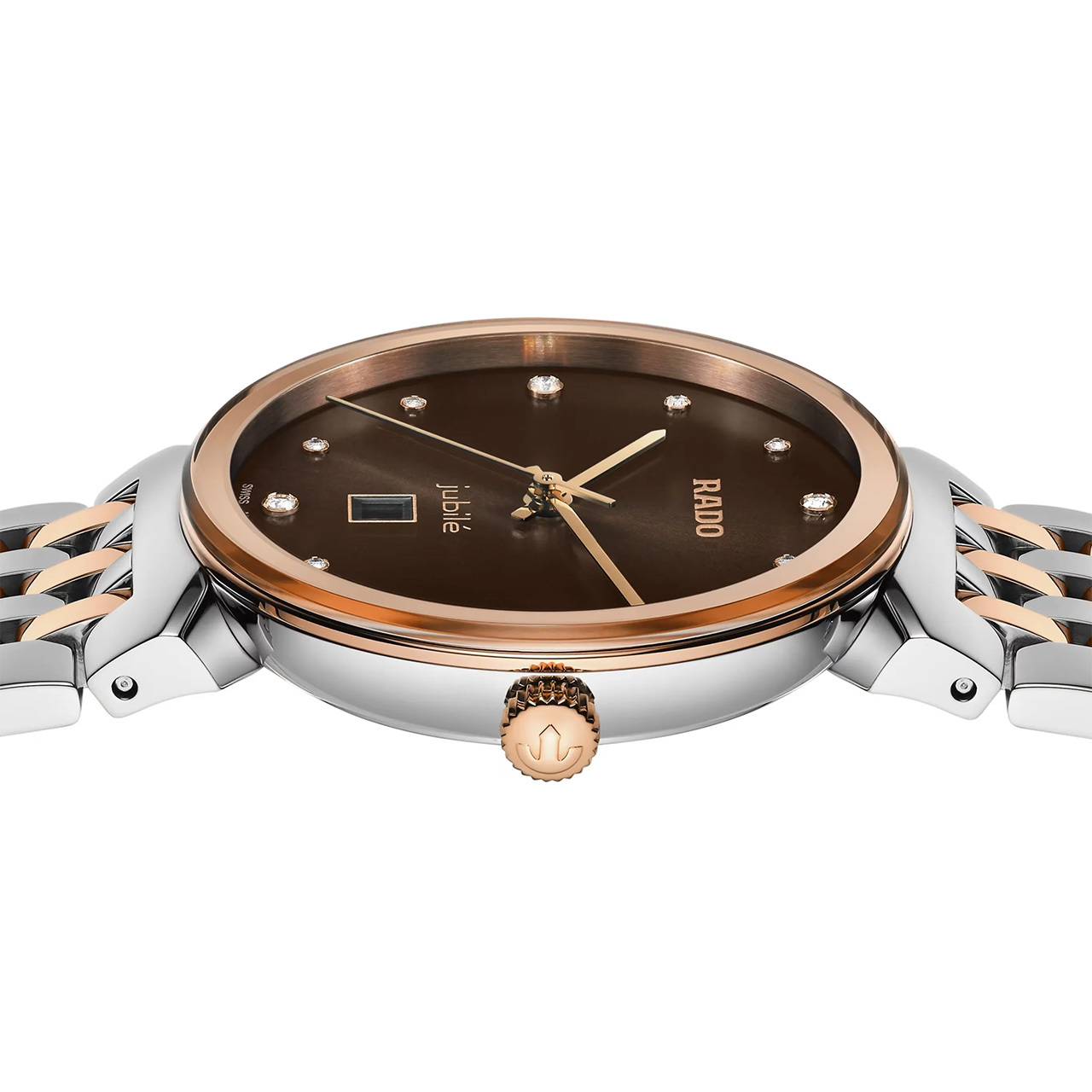 Корпус: Нержавеющая сталь с частичным PVD-покрытием розового золота. Коричневый циферблат с золотистыми стрелками и часовыми индексами, декорирован 12 бриллиантами. Инновационное металлизированное сапфировое стекло. Рифленая заводная головка. Диаметр 30 мм. Водонепроницаемость 50 метров.