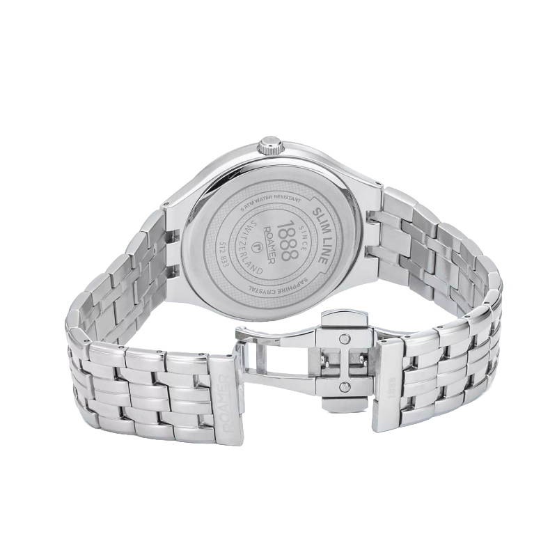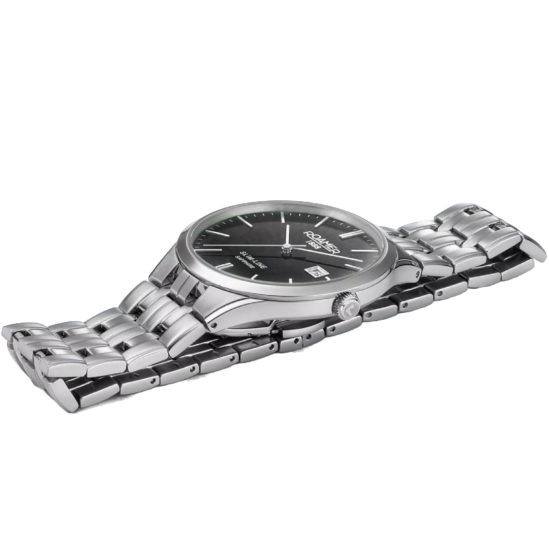 Корпус: Высококачественная нержавеющая сталь, марки 316L с повышенной устойчивостью к коррозии и полировкой до зеркального блеска. Черный циферблат. Накладные индексы серебристого цвета и тонкие стрелки обеспечивают четкую читаемость, не нарушая минималистичный стиль. Сапфировое стекло с антибликовым покрытием. Рифлёная заводная головка с логотипом марки «Roamer». Диаметр: 30 мм. Водонепроницаемость: 50 м.