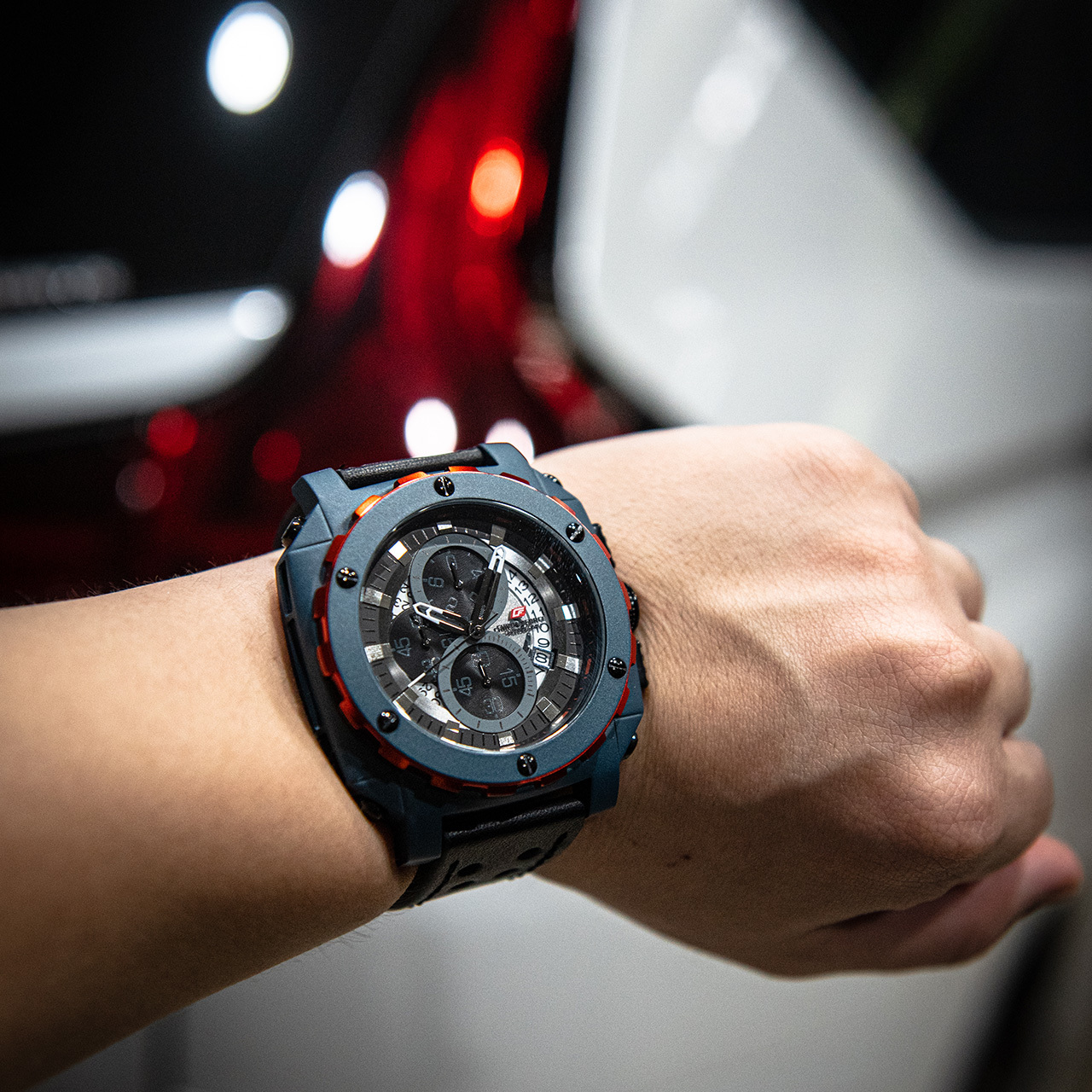 Ремешок: Ремешок из натуральной кожи чёрного цвета с перфорацией защищает кисть от запотевания, имеется двойной тренчик, который надежно зафиксирует его кончик. Каждые часы бренда Chronoforce имеют уникальную упаковку, в виде мотоциклетного шлема.