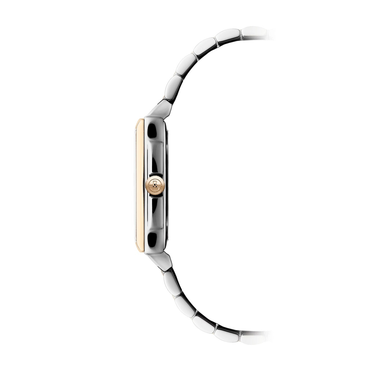 Корпус: Корпус прямоугольной формы выполнен из нержавеющей стали марки 316L, безель и переводная коронка с PVD покрытием цвета розового золота. Циферблат из натурального перламутра, аппликация римских цифр и граненые стрелки имеют покрытие золотом, циферблат украшен инкрустацией 8 бриллиантов 8/8 SI2 - SI1, весом 0,026 карата, в качестве часовых индексов. Сапфировое стекло имеет повышенную устойчивость к возникновению царапин. Водостойкость 50 метров. Корпус модели имеет размеры: 22,6 на 28,1 мм, толшина - 6,4 мм.