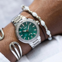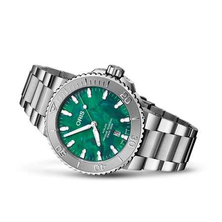 Коллекция: Bracenet Aquis Automatic. Новое сотрудничество Oris с Bracenet поддерживает миссию экологического предприятия по защите морей. Эти часы Aquis с калейдоскопическим зеленым циферблатом, выполненным из переработанных рыболовных сетей. Каждый циферблат уникален благодаря случайному процессу. В результате получился циферблат, вдохновлённый океаном, - ежедневное напоминание о вашем вкладе в сохранение океана.