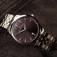 Корпус: Круглый корпус выполнен из нержавеющей стали 316L, поверхность с матовой шлифовкой – сатинированием и полировкой до алмазного блеска. Чёрный циферблат с эффектом солнечных лучей (Sunray). Накладные часовые индексы и клиновидные стрелки в стиле Dauphine выполнены из стали с родиевым покрытием. Сапфировое стекло с антибликовым покрытием устойчиво к царапинам сохраняет прозрачность на протяжении многих лет. Заводная головка украшена фирменным логотипом. Диаметр корпуса составляет: 39 мм., толщина - 9 мм. Класс водозащиты: 10 бар (100 метров), позволит плавать.