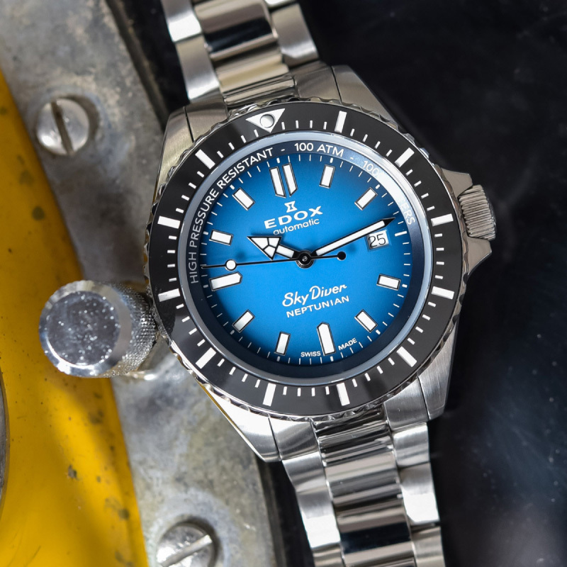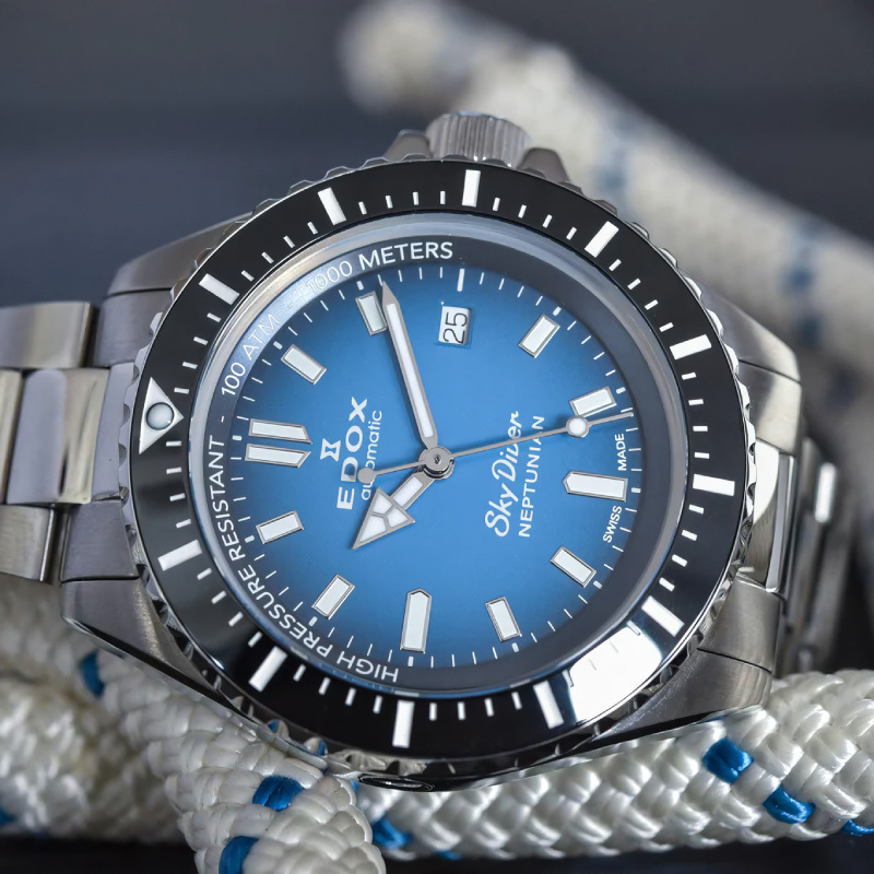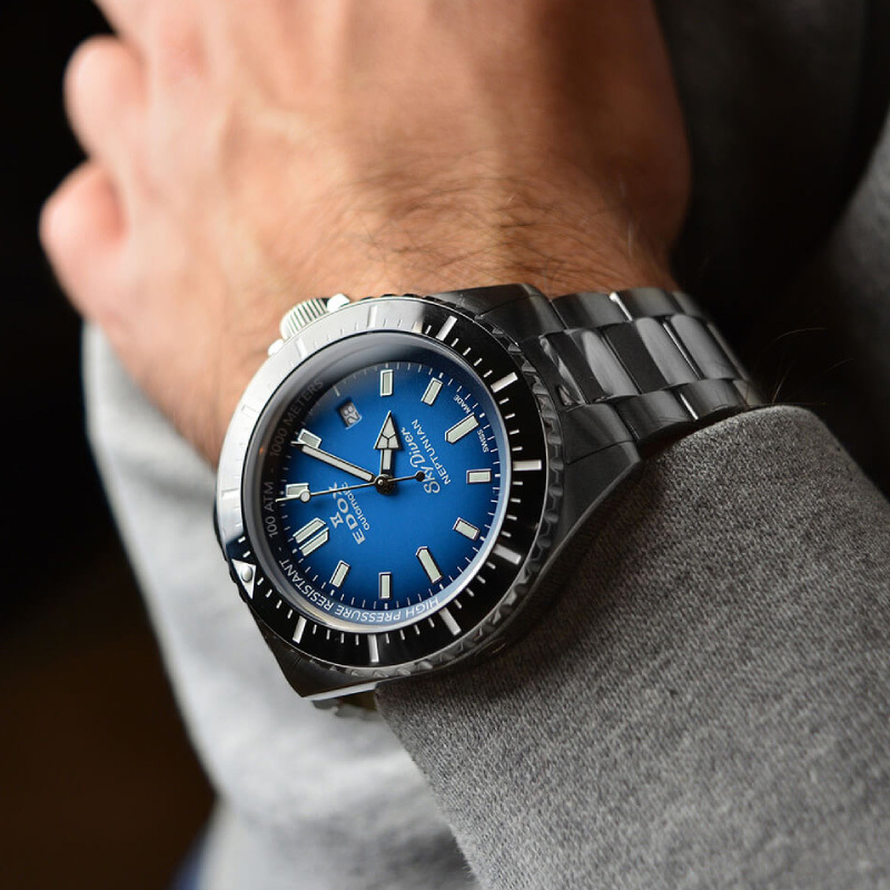 Корпус: Корпус из высококачественной нержавеющей стали, керамический безель чёрного цвета. Синий циферблат. Часовые индексы и стрелки стальные, полированные с покрытием Super-LumiNova®. Сапфировое стекло с антибликовым покрытием. Однонаправленный безель вращается со щелчками в направлении против хода стрелок, рельефная поверхность с гравированной разметкой в виде больших цифр. Завинчивающаяся заводная головка с защитой. Диаметр: 44 мм. Водонепроницаемость: 1000 м.
