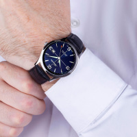 Корпус: Круглый корпус выполнен из полированной нержавеющей стали. Синий циферблат. Накладные часовые индексы выполнены из стали. Стрелки с покрытием SuperLuminova, которое обеспечивает подсветку в темное время суток. Минеральное стекло. Диаметр корпуса составляет 42 мм, толщина 10 мм. Водостойкость WR 50 (мытье рук, дождь).