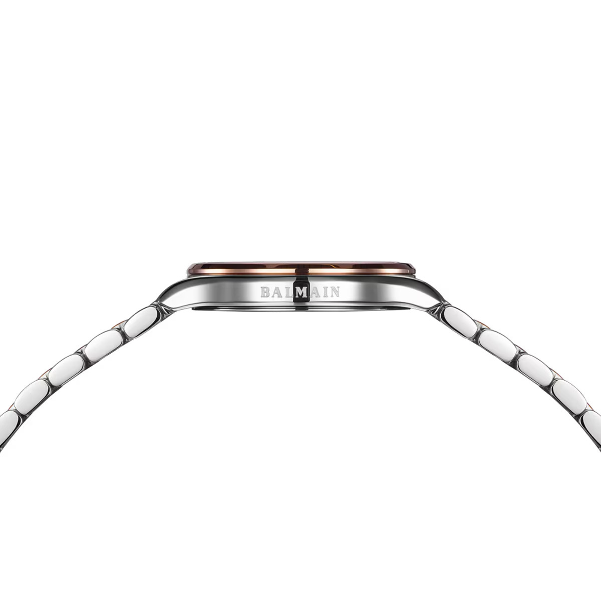 Корпус: Корпус из нержавеющей стали c частичным PVD - покрытием розового золота, поверхность с полировкой до зеркального блеска. Циферблат шоколадного оттенка украшен 11 бриллиантами Top Wesselton VS-SI общим весом 0,041 карата. Часовые индексы и стрелки выполнены из стали с позолотой. Сапфировое стекло, устойчивое к появлению царапин, обладающее высокой прозрачностью. Диаметр корпуса составляет 32 мм. Водонепроницаемость: 30 м.