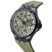 Корпус: Корпус выполнен из высококачественной стали с повышенной устойчивостью к коррозии с PVD-покрытием. Циферблат скелетон зелёного цвета. Стрелки и часовые индексы чёрного цвета с покрытием Super-LumiNova®. Сапфировое стекло с антибликовым покрытием. Заводная головка с защитой. Завинчивающаяся задняя крышка и заводная коронка. Диаметр: 43 мм. Водонепроницаемость: 200 м.