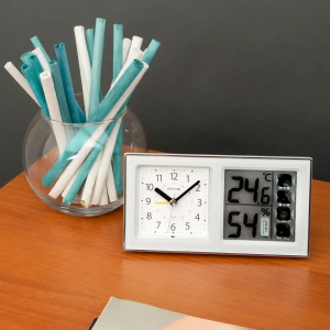 Механизм: Настольные кварцевые часы-будильник с дополнительным LCD дисплеем. На дисплее отображаются данные термометра и гигрометра, вы всегда будете в курсе окружающей температуры и влажности в помещении, где находится будильник. 4 значка экологического стандарта. Отсрочка сигнала на 5 минут. Подсветка циферблата светодиодом. Элемент питания типа АА х 2 шт. (в комплекте). Вес 200 грамм. 4 С
