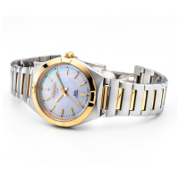 Корпус: Корпус выполнен из высококачественной нержавеющей стали 316L с полировкой и матовой шлифовкой - сатинированием, с частичным покрытием жёлтого золота. Перламутровый циферблат, позолоченные стрелки и часовые индексы в виде штрихов с люминесцентным покрытием Super-LumiNova для оптимальной разборчивости в условиях низкой освещенности. Сапфировое стекло с антибликовым покрытием. Рифленая заводная головка. Диаметр: 34 мм. Водонепроницаемость: 50 м.