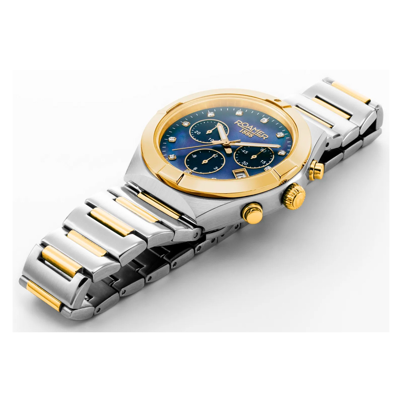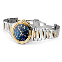 Корпус: Корпус выполнен из высококачественной нержавеющей стали 316L с полировкой и матовой шлифовкой - сатинированием, с частичным покрытием жёлтого золота. Перламутровый циферблат синего цвета, позолоченные стрелки с люминесцентным покрытием для оптимальной разборчивости в условиях низкой освещенности. Инкрустация 12 бриллиантов в качестве часовых индексов. Сапфировое стекло с антибликовым покрытием. Диаметр: 38 мм. Водозащита: 100 м.