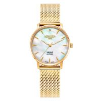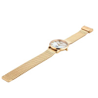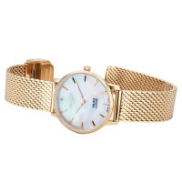 Корпус: Корпус выполнен из высококачественной нержавеющей стали 316L, с IP покрытием. Перламутровый циферблат белого цвета декорирован 1 бриллиантом, золотистые стрелки и часовые индексы. Стрелки с люминесцентным покрытием для оптимальной разборчивости в условиях низкой освещенности. Сапфировое стекло с антибликовым покрытием. Диаметр: 32 мм. Водозащита: 50 м.