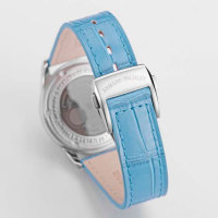 Ремешок: Голубой кожаный ремень с тиснением под кожу аллигатора.