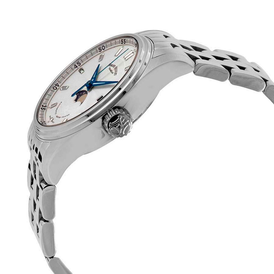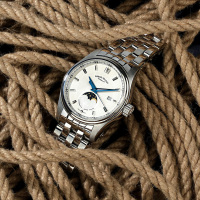 Корпус: Нержавеющая сталь. Сетлый циферблат, украшен декоративным узором - гильоше. Рифленая заводная головка. Сапфировое стекло с антибликовым покрытием, устойчивое к механическим повреждениям. Прозрачная задняя крышка. Механизм усложнен функцией – индикатором фазы луны. Диаметр 42 мм. Водозащита 100 м.